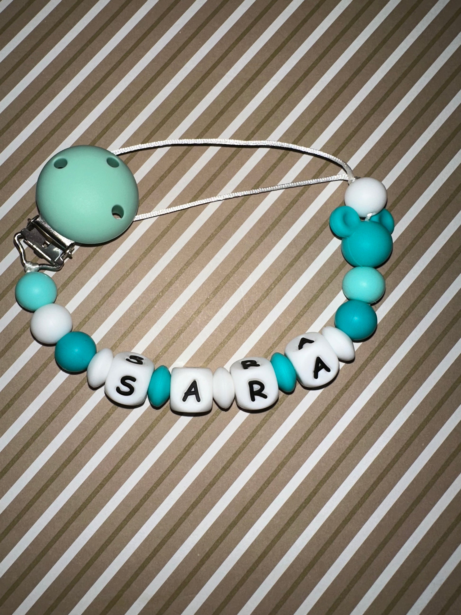 Dale un toque adorable y seguro a tu bebé con nuestro chupetero personalizado azul y verde.